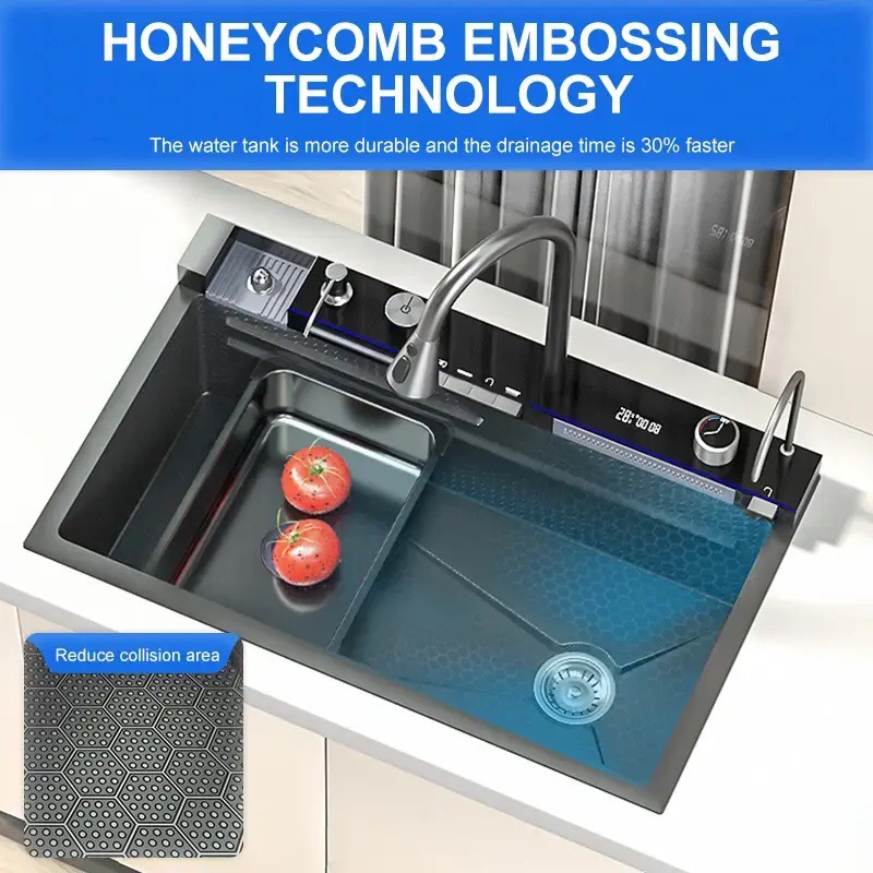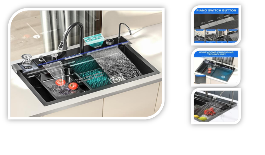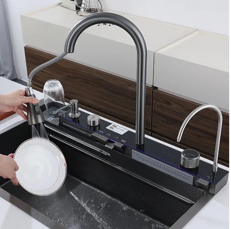 chậu đúc nano thác nước đa năng, chậu có voi dây rút bát sen to với ba chế độ nước( tia nước bát sen chéo, tia nước chụm, tia nước tưới). Chậu tích hợp vòi nước sạch. chậu có nút tròn vặn điều chỉnh lượng nước nóng. Có màn hình hiển thị nhiệt độ không làm trẻ con người già bị bỏng. Điều khiển chế độ lấy nước bằng phím bấm. Có nút vặn chòn điều khiểm xả nước. Tích hợp trên chậu là thiết bị đựng dầu rửa bát hoặc dầu rửa tay. Chậu có vòi rửa tráng cốc. Bề mặt thùng chậu chống bám vân tay, hạn chế chầy sước và dễ lau chùi. Đặc biệt chậu có hai thác nước .Chậu thoát nước nhanh, ngăn mùi hôi, có chồng ồn bằng cáo su ngăn đổ mồ hôi chậu