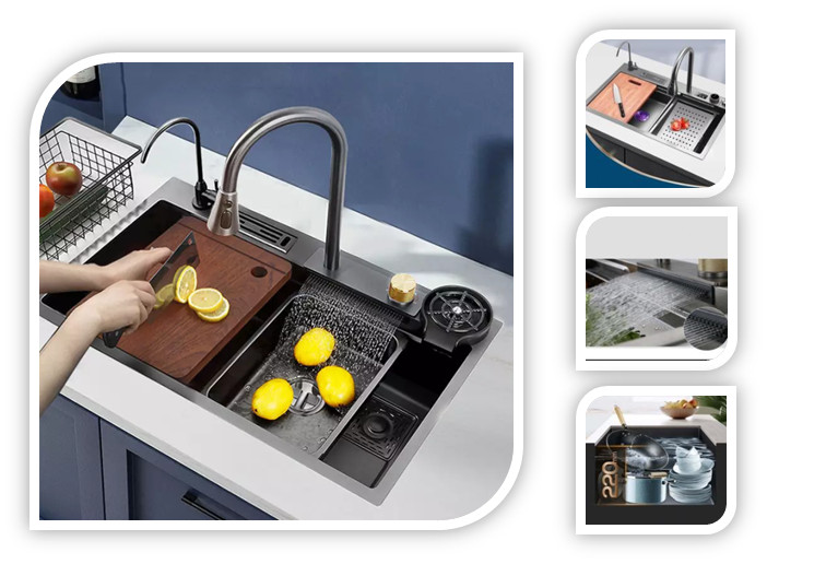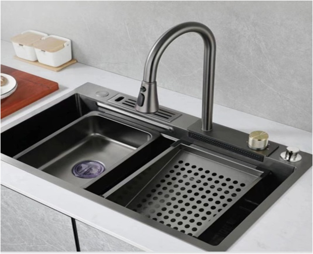 chậu đúc nano thác nước đa năng, chậu có voi dây rút bát sen với ba chế độ nước( tia nước bát sen chéo, tia nước chụm, tia nước tưới) . Bề mặt chậu có lớp Namo . Có chậu nhỏ dùng để ngâm hoặc rửa đồ, có rổ vát để đồ ráo nước. Mặt chậu dầy dặn,mối hàn kín và sâu, chậu chắc chắn bền bỉ với thời gian . Chậu có bộ ống xả nước thông minh , ngăn mùi hiệu quả, bộ lọc rác bằng inox. có lớp chống ồn bằng cao su và chống ngưng tụ đáy chậu, chậu có lỗ chờ lắp thêm vòi máy lọc nước hoặc ống đựng nước rửa bát
