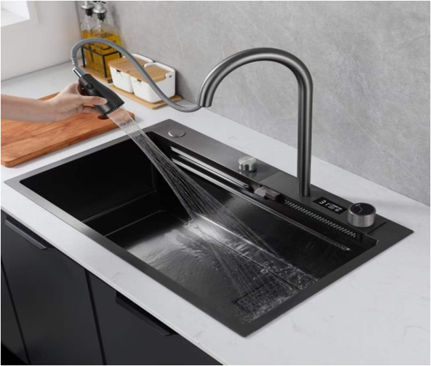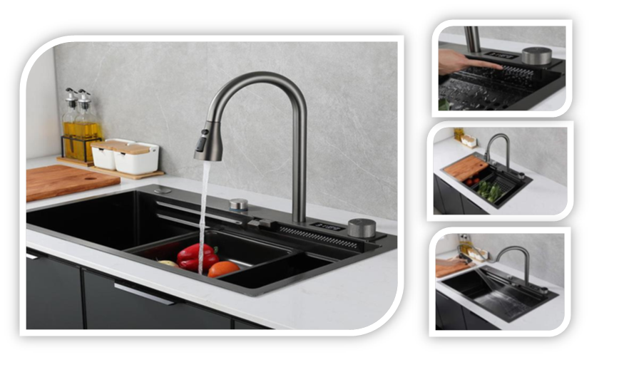 chậu đúc nano thác nước đa năng, chậu có voi dây rút bát sen với ba chế độ nước( tia nước bát sen chéo, tia nước chụm, tia nước tưới) . Bề mặt chậu có lớp Nano . Có chậu nhỏ dùng để ngâm hoặc rửa đồ, có rổ vát để đồ ráo nước. Mặt chậu dầy dặn,mối hàn kín và sâu, chậu chắc chắn bền bỉ với thời gian . Chậu có bộ ống xả nước thông minh , ngăn mùi hiệu quả, bộ lọc rác bằng inox. có lớp chống ồn bằng cao su và chống ngưng tụ đáy chậu, chậu có lỗ chờ lắp thêm vòi máy lọc nước hoặc ống đựng nước rửa bát